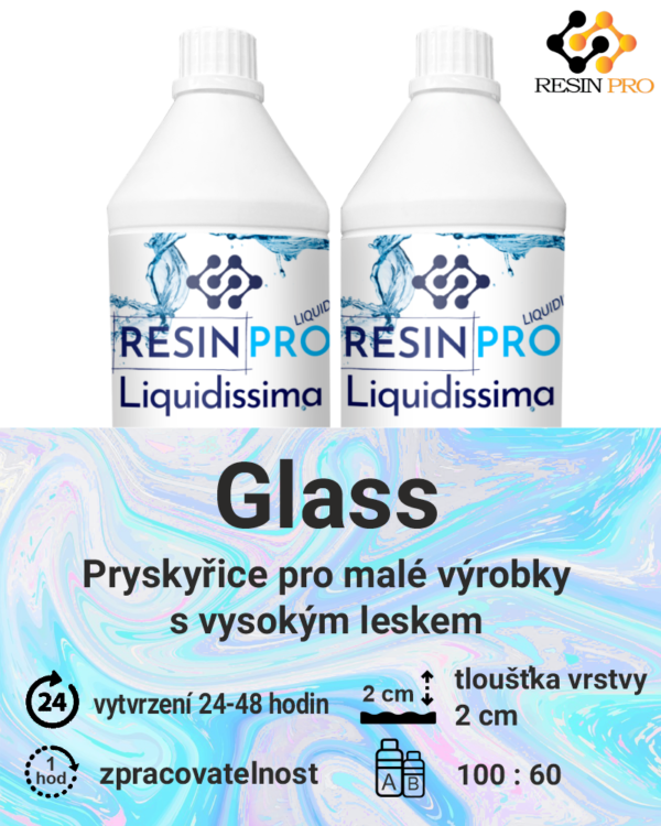 Křišťálová pryskyřice Glass byla vynalezena přímo pro výrobu odlitků, které mají hodně detailů a tloušťku od 1 mm do 20 mm s velikostí plochy ne více než 5×5 cm. Pryskyřice má speciální vlastnosti, díky kterým se v ní tvoří méně vzduchových bublin. Tyto vlastnosti jsou vysoká průhlednost (efekt vody), samonivelační vlastnosti, nízká viskozita a delší doba tvrdnutí ve srovnání s tradiční epoxidovou pryskyřicí. Díky delší době tvrdnutí tak můžete výrobek dále ohýbat a upravovat do dalších tvarů bez potřeby dalších speciálních pomůcek a forem. Po zatvrdnutí má pevný, zrcadlově lesklý a naprosto hladký povrch. Má vysokou ochranu před vlhkostí vzduchu během vytvrzovacího procesu.